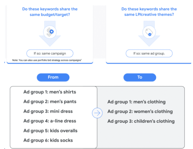 • Alinear la estructura con la IA: es crucial reorganizar los grupos de anuncios en torno a temas en lugar de centrarse exclusivamente en palabras clave individuales. Esta práctica permite a la IA optimizar las campañas para objetivos específicos, lo que conduce a una mayor eficiencia en la entrega de anuncios y maximiza las conversiones.