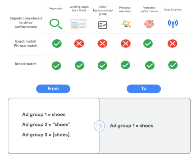 • Consolidar tipos de concordancia: unificar todos los tipos de concordancia en un único grupo de anuncios y priorizar la concordancia amplia puede resultar beneficioso.